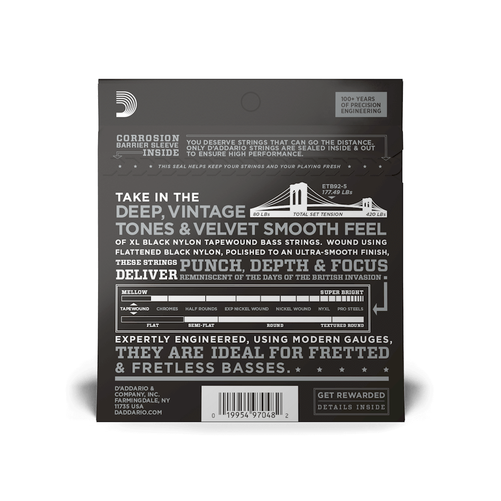 מיתרי “tape wound” מתאימים להרבה סגנונות אך הבולטים שבהם הם ג’אז פופ ור&ב בשל הצליל המיוחד שלהם.. המיתרים מלופפים בניילון ומוחלקים ומכאן שמם “tape wound”. מיתרים בעלי ליבת פלדה משושה המעניקים סאונד חם ועמוק במיוחד. שומרים היטב על כיוון ומארכים חיים. סט זה מיועד לבס 5 מיתרים והוא מאפשר גמישות מירבית תוך שמירה על צליל עשיר וחם מאוד.