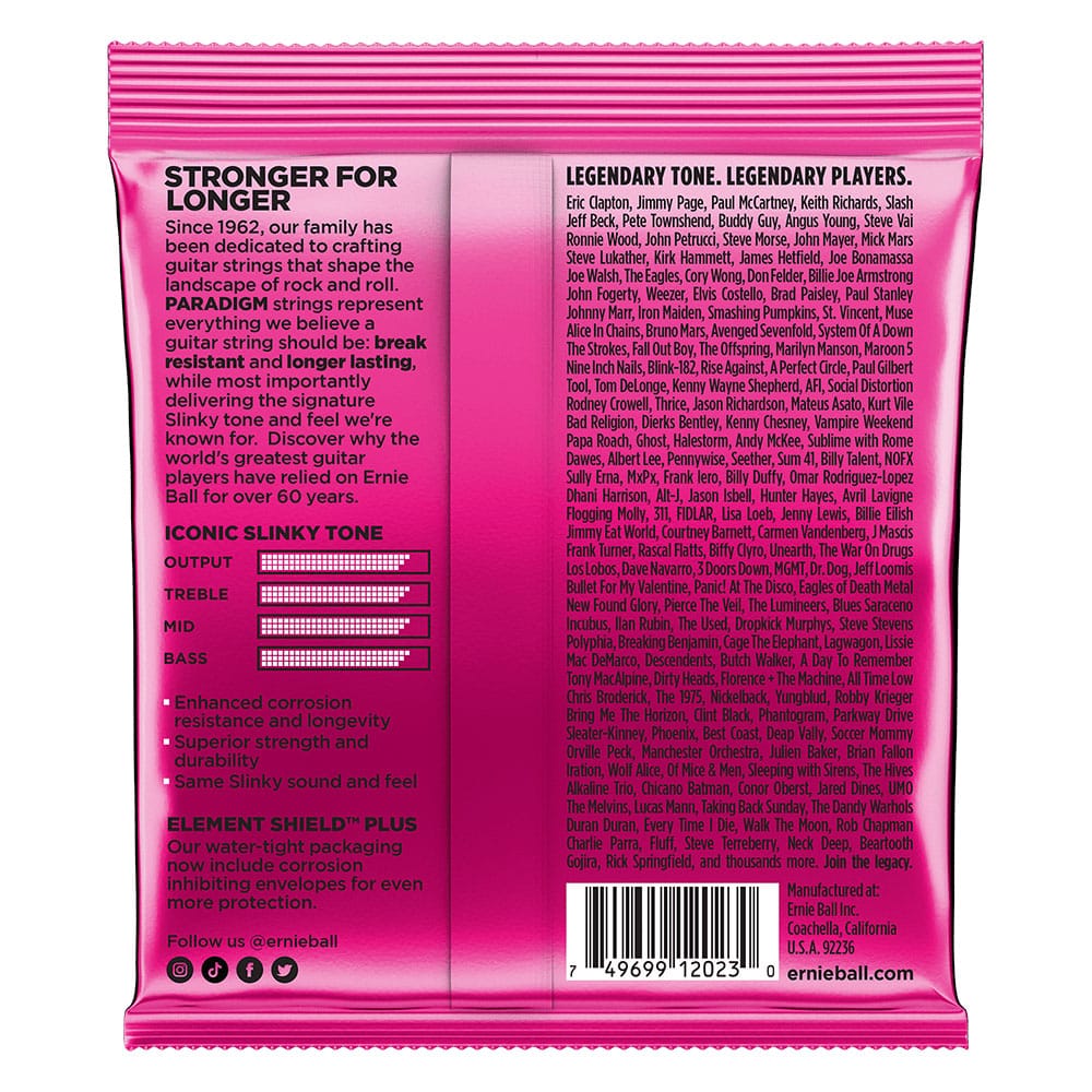 מיתרי ה-Paradigm של ארני בול Earnie Ball מספקים עמידות ואורך חיי מיתר שטרם נראו בעולם, תוך שמירה על מאה אחוז מהטון והתחושה של מיתרי הסלינקי Slinky האהובים.